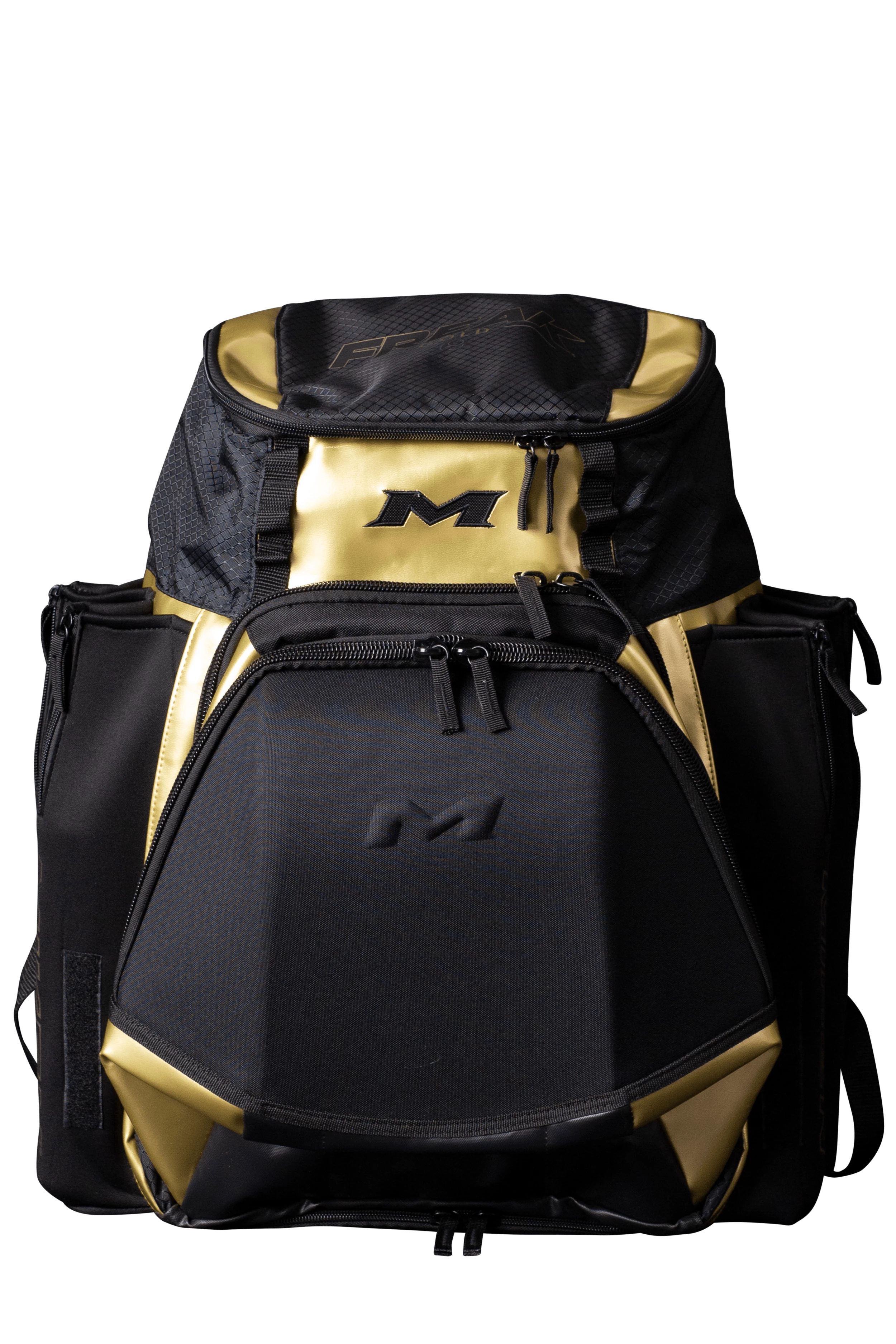 The all new Freak Gold MK7X Series Miken XL Backpack features: 4 zippered neoprene bat sleeves, a durable “J” style fence hook, 2 fleece lined pockets in top valet tray (for phone, accessories, etc), Glove storage, Molded front pocket that converts to shelf, Easy to clean tarpaulin bottom, and a Daisy chain for external batting glove storage.